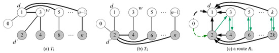 Figure 4a,b illustrate the proof of Theorem 2. The tree diameter is the length of the shortest path between the most distanced nodes, which affects the length of the routing in practice. In [8], the diameters of CISTs in Kn are all 3, and the diameters of our dual-PRTds in Kn are 4, which is slightly worse than the former.