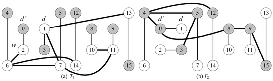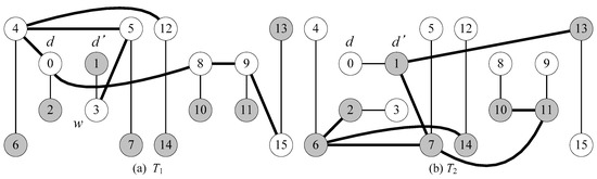 Let destination node d be vertex 1. Dual-PRT1s are shown in Figure 9. Clearly, the diameters of the two trees are 6 and 8 respectively. Vertices 1, 2, 6, 7, 10, 11, 13, and 14 are inner nodes in T1, and vertices 0, 3, 4, 5, 8, 9, 12, 15 are inner nodes in T2. Stems are (1, 7), (1, 13), (2, 6), (6, 7), (6, 14), (7, 11), (10, 11) (respectively, (0, 4), (0, 8), (3, 5), (4, 5), (4, 12), (8, 9), (9, 15)) and leaf edges are (0, 2), (1, 3), (4, 6), (5, 7), (8, 10), (9, 11), (12, 14), (13, 15) (respectively, (0, 1), (2, 3), (4, 6), (5, 7), (8, 10), (9, 11), (12, 14), (13, 15)) in T1 (respectively, T2). Clearly, T1 and T2 obey Definitions 4 and 6. Let d′ be vertex 0 and w be vertex 2, and then Definitions 7 holds. Since all odd vertices belong to the same automorphism group in LTQ4, this lemma holds. □