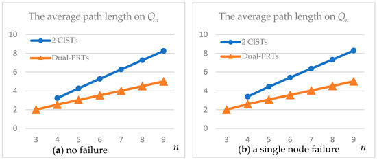 According to Table 2 and Table 3, we have Figure 11 and Figure 12. There are no two CISTs in Q3 by Lemma 1, which is why the blue line (representing 2 CISTs) in Figure 11 starts with count n = 4. For the same reason, the blue line in Figure 12 also starts with count n = 4. Obviously, the average path lengths of protection routing by dual-PRTds are smaller than the ones by two CISTs, no matter the scenario.