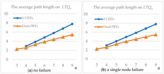 Simulation results: the average path length on LTQn when the routing is with two scenarios: (1) no failure; and (2) a single node failure.