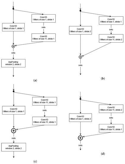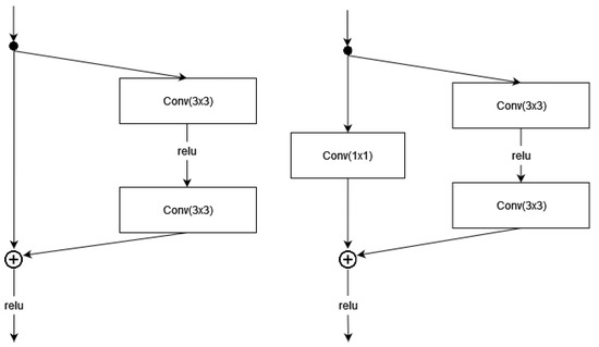 A specific family of CNN architectures is that of Residual Neural Networks (ResNets). One of the main problems deep CNN architectures experience is the gradient vanishing problem wherein weights in the earlier layers of the network cannot be efficiently updated using the gradient, since the gradient is too small in these layers [27]. This gradient vanishing results in the training of very deep networks to be very complex [28]. To avoid this problem, ResNets have shortcut connections that skip over some of the layers in the network. These shortcut connections allow the network to have many layers while still not experiencing the problem of vanishing gradients. Often, ResNets are implemented using residual blocks. These are blocks of convolutional layers. Then, a shortcut connection is added to the output of the residual block. This connection allows the gradient to flow through the shortcut connection, which helps resolve the problems mentioned above (i.e., gradient vanishing). This shortcut connection is generally realized with a connection lacking any intermediate operations or a convolutional layer with kernels of size one, to match the number of filters for the addition. Examples of typical constructions of residual blocks can be seen in Figure 1.