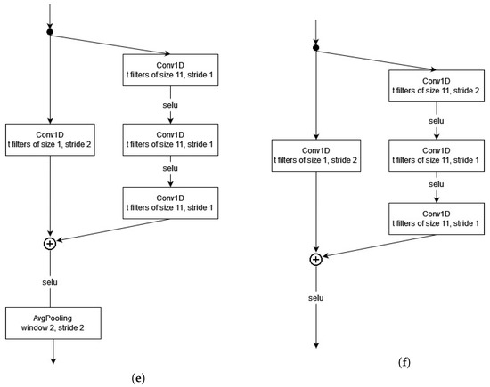 The six types of residual blocks were used for testing follow: (a) An inception block with pooling for down-sampling. (b) An inception block with stride for down-sampling. (c) A two-layer block with pooling for down-sampling. (d) A two-layer block with stride for down-sampling. (e) A three-layer block with pooling for down-sampling. (f) A three-layer block with stride for down-sampling.
