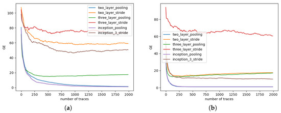Combining all of these results provided several observations. First, using pooling layers over a convolutional stride looked like an obvious choice, as the performance difference was significant. This differed from several of the other ResNets in SCA [12,14], which suggested that these architectures could be improved significantly with this substitution. Second, using more than two convolutional blocks did not look useful in our experiments, and, thus, we chose to use the two-layer block in the next section. Still, the Inception version was a viable alternative. Finally, we showed that using more residual blocks helped the performance of the models for SCA, up to a point. Our experiments showed that using more than seven residual blocks did not improve performance. If we generalize this, when a dataset has x features, using residual blocks seem a reasonable choice as using more residual blocks results in an additional computational overhead, while, as evidenced in our experiments, not improving performance. Our experiments showed that provided reasonable results, but more experiments are needed before giving definitive recommendations. Still, we consider it “safe” to recommend that y should be a small value (e.g., 1 or 2).