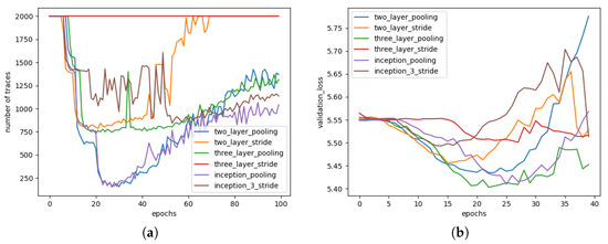 To verify that the networks performed consistently, all of the results in this section were averages over five training runs of the network. Additionally, GE was computed as an average of 100 attacks. Finally, during training, we saved the model that achieved the best validation loss, and we tracked the number of attacking traces required to reach GE = 1. In Figure 4, it can be observed that the average attacking performance of the models with each residual block was significantly worse after the entire 100 epochs, than it was if the model with the best validation loss was used instead. This performance difference was due to the size of the tested networks being larger than necessary for the dataset. Due to this, we observed that the models overfitted, as can also be seen in Figure 5. Additionally, we observed that the models using pooling for feature map size reduction consistently performed better than those using convolutional stride. We believe this might be because when a convolutional stride was used (Stride controls the amount of movement over the data. The larger the stride, the more downsampling of the data.), specific patterns might be skipped over in the convolutions. Skipping these patterns could result in specific leakage points being missed entirely, resulting in worse performance. Finally, we observed that the two_layer_pooling- and the inception_pooling blocks performed best out of the chosen residual blocks, with the difference in attacking performance between these two being negligible.