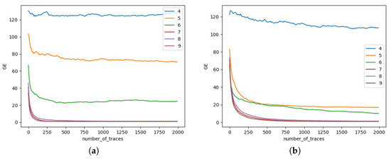 - Guessing Entropy: Guessing entropy (GE) [32] is the average key rank over a number of attacks. This is defined as , where is the mean function. As is commonly done, we estimated it over 100 attacks.