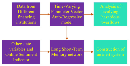 By reviewing the studies above and Table 1, it can be observed that currently, research on financial hazard overflow and hazard alert systems have been conducted separately, to the best of my knowledge. Comprehensive research on these topics requires knowledge from multiple domains, including finance, economics, hazard management, and computer science. In addition, it may necessitate collaboration and communication among experts from different fields to conduct integrated research. However, once the study of financial hazard overflow and hazard alert system is combined, it enables hazardous generation, propagation, and monitoring and warning mechanisms to be comprehensively considered, providing a more comprehensive and in-depth understanding. This integrated research can help people better comprehend the nature of financial hazard and explore the interactions between hazard propagation and warning mechanisms. Through comprehensive research, more accurate and comprehensive hazard assessments and decision support can be provided, thereby strengthening financial stability and hazard management capabilities. Indeed, this is precisely the unique aspect of the proposed method. Specifically, this paper selects 30 financial institutions as research samples and uses the Time-Varying Parameter Vector Auto-Regressive (TVP-VAR) model to study the hazard overflow effect in the financial industry and construct financial hazard measurement indicators. It examines the nonlinear relationship between macroeconomic state variables such as returns, volatility, short-term liquidity spreads, and financial hazards. Additionally, the paper incorporates OSIs (Online Sentiment Indicators) into the LSTM model to construct a financial hazard alert system. The overall sketch is shown in Figure 1, and the contributions of this paper are twofold: