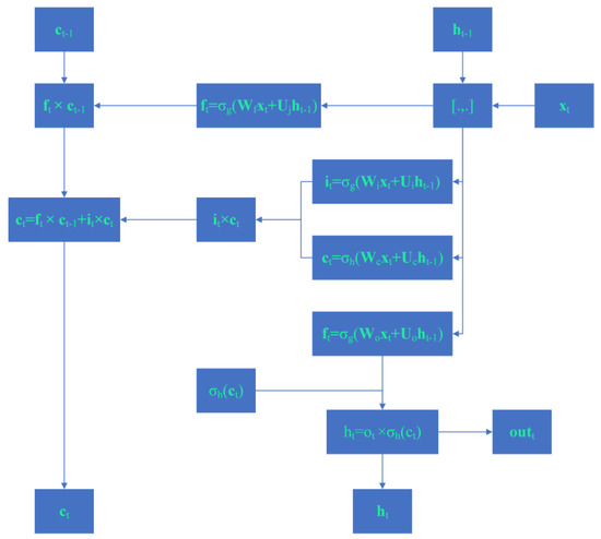 In this paper, the LSTM network is adopted as the alert model. LSTM is a type of recurrent neural network (RNN) that can address issues commonly found in RNNs, such as gradient explosion or vanishing gradient. It is suitable for processing and predicting time-series data. Figure 2 illustrates the recurrent unit structure of LSTM. The matrices W and U represent the weights for input connections and recurrent connections, respectively. These weights include bias terms, and the subscripts of the weights denote the input gate (i), output gate (o), forget gate (f), and memory cell (c). σ denotes the activation function; × represents the Hadamard product. xt is the vector input to the LSTM unit, ft is the vector after the activation of the forget gate, it is the vector after the activation of the input gate, ot is the vector after the activation of the output gate, ht is the hidden state vector, ht−1 represents the hidden state of the previous time step, is the vector after the activation of the cell input, ct is the cell state vector, ct−1 represents the cell state of the previous time step, xt represents the input data, xt−1 represents the input data of the previous time step, and xt represents the output data. In this paper, LSTM is utilized to learn about historical financial alert indicators and attempt to predict future alert indicators. Please refer to Section 3.2.1 for more details.
