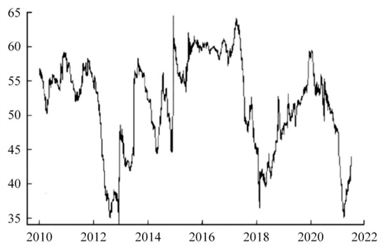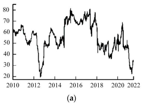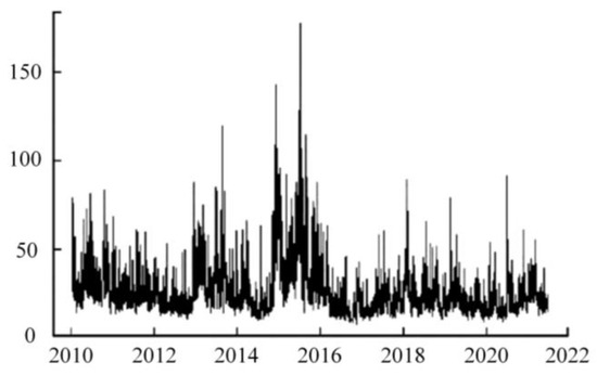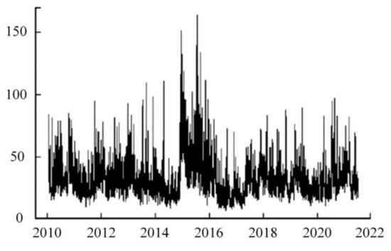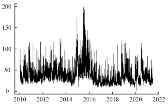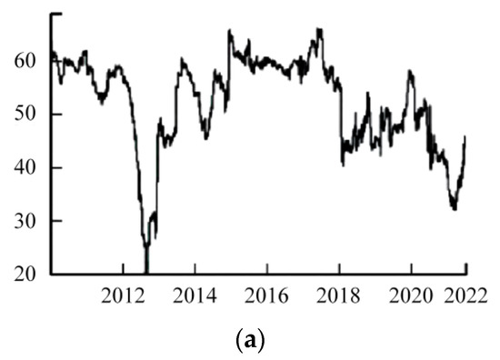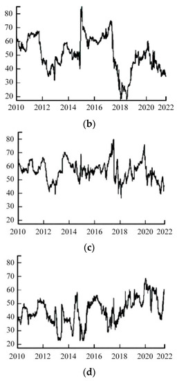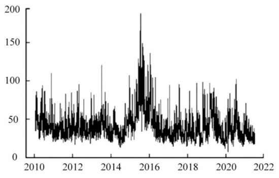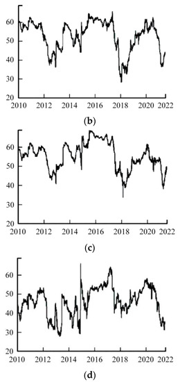 in which represents the estimated daily variance of institution i (i.e., an industry) at day t, represents the maximum (high) price in institution i at day t, represents the minimum price of institution i at day t, and represents the annualized daily volatility of institution i at day t. Due to the relationship between the daily range of prices and the volatility and variance of prices in the financial field, the constant 0.361 is an empirical value used to adjust the calculation results of the daily range variance to better align with market reality. The constant 365 represents the number of trading days in a year, and multiplying by 365 serves to convert the daily variance to an annualized variance. When daily volatility is scaled to an annual scale, it provides a better reflection of the institution’s annual volatility level. Multiplying by 100 is performed to express the volatility as a percentage. Representing volatility as a percentage allows for a more intuitive understanding and comparison of the volatility of different institutions [22].