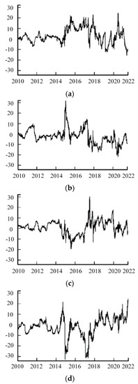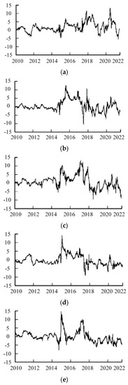 in which represents the column vector of volatility at day t, represent time-varying coefficients, is the vectorized representation, and and represent time-varying variance–covariance matrices. The time-varying coefficients and time-varying variance–covariance matrices are estimated iteratively with the Kalman filter. Due to space limitations, please refer to [23] for more details. The constraints in (3) and (4) are the classical assumptions for the probability distribution of the random error terms in time-series analysis. Specifically, given the information observed up to day t − 1, the distribution of the random variable follows a normal distribution with a mean of 0 and a covariance matrix of or . This assumption is commonly used in statistical inference and modeling methods. In this context, or and or represent the conditional distribution relationship. represents the random error term in the observation equation, indicating the error in the observed data. On the other hand, represents the state error term in the state equation, reflecting the variability in parameters or states. Therefore, their distributions are not the same.