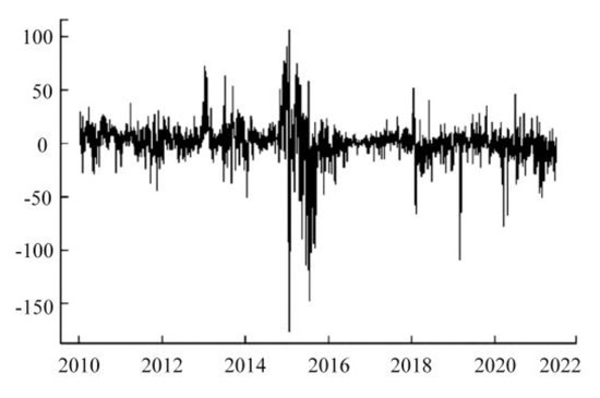 In this paper, we select the individual stock discussion area of 30 listed companies on the East Money website as the source of text information. We use Python to collect comment data from 1 January 2010 to 31 December 2022. The data include post titles, click-through rates, reply counts, usernames, posting time, and post content. After data cleansing, we utilize the Jieba word segmentation library to perform text segmentation and construct an OSI. Figure 17 shows the changes in online sentiment during the sample period.