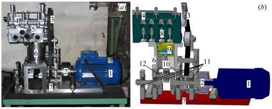 Photograph (a) and longitudinal section (b) of a piston engine model for studying unsteady heat transfer in the intake system: 1—electric motor; 2—flexible coupling; 3—camshaft with a pulley; 4—cylinder head; 5—inlet pipe; 6—cylinder; 7—common frame; 8—inlet valve; 9—piston; 10—connecting rod; 11—rolling bearings; 12—crankshafts.