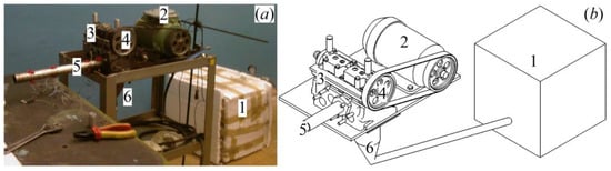 Photograph (a) and general view (b) of the experimental bench for studying unsteady heat transfer in the exhaust system: 1—tank with a leveling lattice inside; 2—electric motor; 3—block head; 4—camshaft with a pulley; 5—exhaust pipe; 6—cylinder.