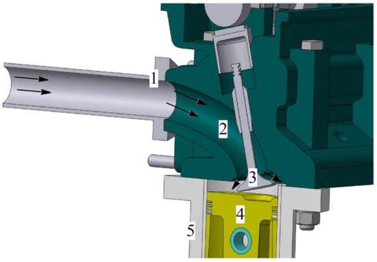 The key elements of gas-dynamic systems: 1—inlet or outlet pipeline; 2—curvilinear channel in the block head; 3—inlet or outlet valve; 4—piston; 5—cylinder. Note: the arrows indicate the direction of airflow in the study of unsteady heat transfer in the intake system.