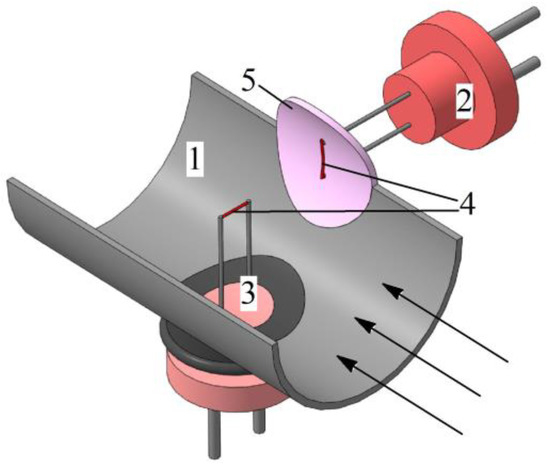 Installation of sensors in the measuring section: 1—inlet or outlet pipeline; 2—thermal sensor; 3—sensor for measuring the flow rate; 4—heated thread (sensing element of sensors); 5—fluoroplastic substrate. Note: the arrows indicate the direction of airflow in the investigated gas-dynamic system.