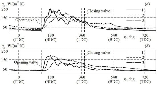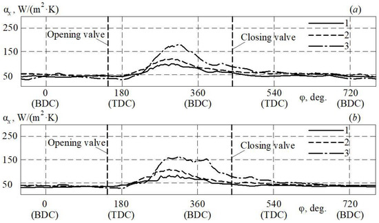 Figure 9 shows that an intense change (increase) in the local heat-transfer coefficient begins immediately after opening the outlet valve. This is due to the beginning of the gas flow in the outlet pipeline. At the same time, the values of the local heat-transfer coefficient do not become equal to zero after the outlet valve is closed. A change in αx stabilizes in the region of 540 degrees of the angle of rotation of the crankshaft. It should be noted that the crankshaft speed does not significantly affect the maximum values of the local heat-transfer coefficient (differences are 10–17%). However, the frequency of the crankshaft rotation leads to a shift of the maximum αx towards larger values of the crankshaft rotation angle. The dynamics of the process become easier as the control section moves away from the exhaust port in the head of the model engine block.