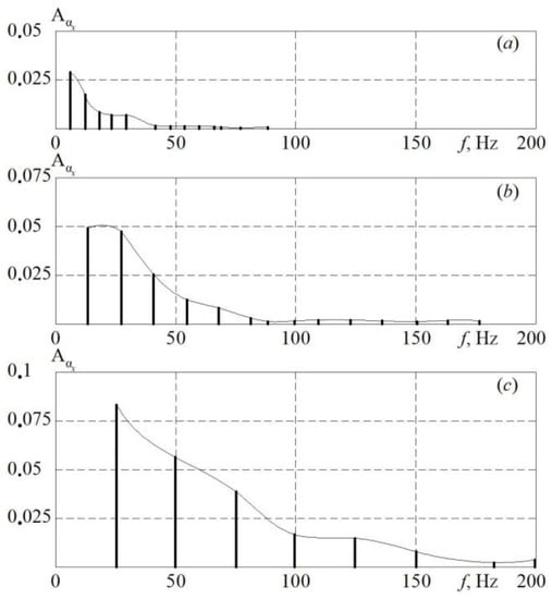 From Figure 10, it can be seen that the first significant frequency of the spectrum corresponds to the rotational speed of the test camshaft: 5 Hz for n = 300 rpm, 12.5 Hz for n = 750 rpm, and 25 Hz for n = 1500 rpm. The first significant amplitude is always the largest and is determined by the camshaft speed. With an increase in the pulsation frequency f, a non-linear decrease in the amplitudes Aα takes place. In this case, at n = 300 rpm, the significant frequencies of the spectrum extend up to 170 Hz, and at n = 1500 rpm, up to 250 Hz. It should be noted that the pulsation amplitudes at a camshaft speed of n = 300 rpm have higher values than for n = 750 rpm and n = 1500 rpm. Consequently, it can be concluded that with an increase in the crankshaft speed, the process dynamics decrease (stabilize). It should also be noted that significant frequencies have a multiplicity equal to the value of the first significant frequency for the corresponding test bench operation mode (5, 12.5, and 25 Hz, respectively).