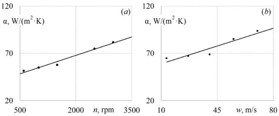 Dependence of the average heat-transfer coefficient α in the inlet pipeline on the crankshaft speed n (a) and on the average flow rate w (b).