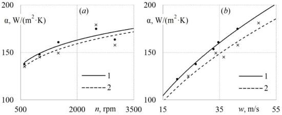 Dependence of the average heat-transfer coefficient α in the outlet pipeline on the crankshaft speed n (a) and on the average flow rate w (b) for different initial pressures in the cylinder pb: 1—pb = 0.1 MPa; 2—pb = 0.2 MPa.