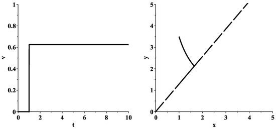 Figure 5 shows the graph of the optimal control and the behavior of the corresponding optimal trajectory in the relaxed minimization problem (19) for the values of the parameters, initial conditions and final moment T presented in (64). It is easy to see that the inequalities (8), (9) and (43), as well as the inequality , are satisfied. In addition, according to Formula (46), the value . Therefore, the optimal control is determined by the right formula in (37), where . The behavior of the corresponding optimal trajectory is given in Figure 5 (right). The objective function (17) takes the smallest value .