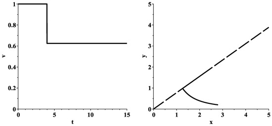 for each point . This fact may lead to the absence of an optimal solution in the minimization problem (18). We will verify its correctness later. To overcome this problem, we will further apply the traditional approach, which consists in considering a relaxed minimization problem [31]). Such a problem is constructed as follows. First, the convex hull of the set of admissible velocities is taken. Due to the linearity of the components and in variables x, y and v, this action is equivalent to taking the convex hull of the control set V. As a result, the two-point set V turns into the segment . Then, instead of the set of admissible controls , we consider the set of admissible controls . It consists of all possible Lebesgue measurable functions that satisfy the inclusion for almost all . Here, U is a new control set.