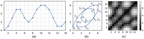 The steps of coding time series data using recurrence plot: (a) a time series with length ; (b) the 2D phase space trajectory is constructed from by the time delay embedding (τ = 1), states in the phase space are shown with bold dots: : (, ), : (, ),, : (, ). (c) the recurrence plot is a square matrix with , .