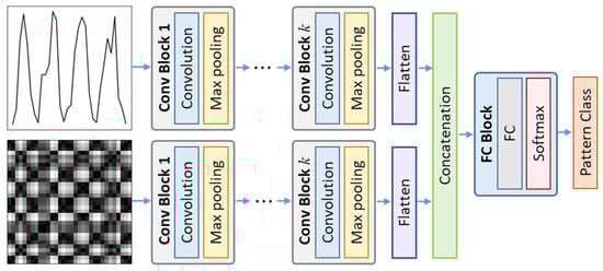 The architecture of an MCDCNN is similar to a standard CNN, but the input data have multiple channels instead of a single channel. Each convolutional layer in an MCDCNN operates on all input channels independently and computes separate feature maps. These feature maps are then combined through concatenation before being passed to the fully connected layer in the network. This study utilizes two channels: the first channel processes 1D raw time series data, while the second channel handles time series images encoded through the RP transform. The model architecture used in the experiments is depicted in Figure 5.