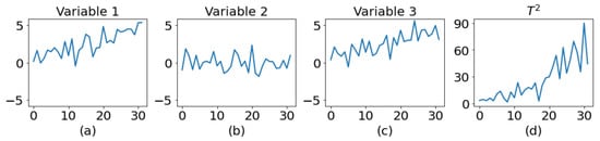 Figure 6 illustrates the data variations that occur on the multivariate control chart when individual variables exhibit non-random patterns. This example includes three variables, and the correlation coefficient between each pair of variables is 0.7. Figure 6a represents the data with a trend in Variable 1, Figure 6b represents the normal data for Variable 2, Figure 6c represents the data with a trend in Variable 3, and Figure 6d illustrates the data variations observed on the control chart.