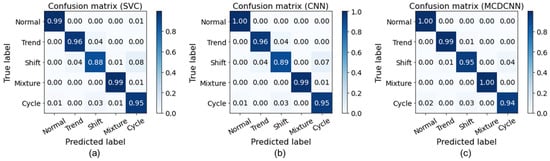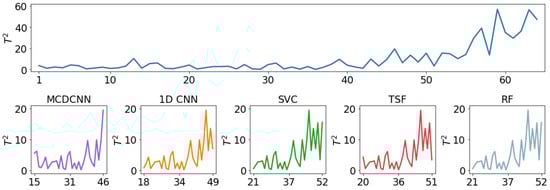 Figure 11 presents the results of various models in detecting and classifying trend patterns. For the purpose of explanation and comparison, we made adjustments to the data, with the non-random pattern starting from the 33rd observation. As seen in Figure 11, the MCDCNN correctly identifies the non-random pattern as a trend pattern in the 15th analysis window (composed of observations from the 15th to the 46th data point). The 1D CNN model, on the other hand, detects the trend pattern in the 18th window. The SVC, TSF, and RF models detect the trend pattern in the 21st, 20th, and 21st windows, respectively. It is evident that the MCDCNN model outperforms the 1D CNN model and traditional machine learning models. These results align with the findings from previous experiments.