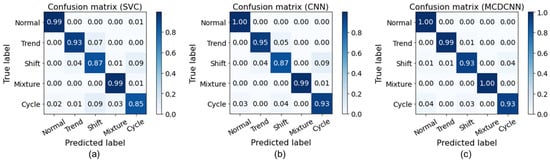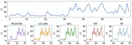Figure 12 displays the results of various models in detecting and classifying the shift pattern. The MCDCNN, 1D CNN, SVC, TSF, and RF models identify the shift pattern in the 16th, 22nd, 23rd, 23rd, and 25th windows, respectively. Based on these results, it is evident that the MCDCNN model is still capable of detecting the shift pattern earlier than the other models.