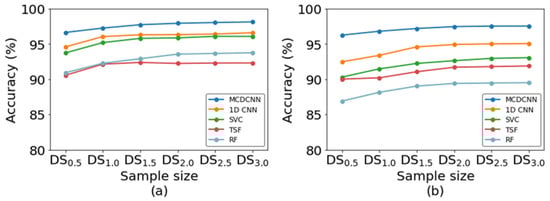 Secondly, the results indicate that the CNN-based models and TSF method are less sensitive to the position of than are other methods. Conversely, the RF and SVC models exhibit a decline in performance if the values of in the training dataset differ from those in the test dataset.