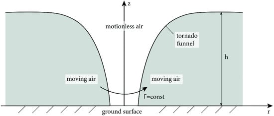 The simplest model of a tornado is a vortex flow with a vertical axis of symmetry and a fixed core (or funnel) [26]. Figure 1 shows a diagram of the vortex under consideration. The axis is the axis of symmetry of the tornado; corresponds to the surface of the Earth. The horizontal axis shows the distance from the axis of symmetry of the tornado. At , the boundary between a stationary funnel and rotating air is .
