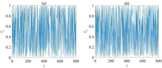 In this model, h1 and h2 are the state control functions, and p and q are the coefficient control functions. From Equation (3), it can be seen that state xi+1 is controlled by yi, and yi+1 is controlled by xi. This method introduces delayed states, and also couples the two one-dimensional maps into a new two-dimensional model. Meanwhile, the coefficient control function is used to generate coefficient variables controlled by their delayed states. As a result, the coefficient variables change during the iterative process, causing the obtained sequences to be unstable, and thus increasing the complexity of the chaotic sequences. To ensure that the coupled model is chaotic, two conditions should be satisfied.