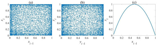 An ideal chaotic system will have a random trajectory without any regular structural characteristics, and will also possess a good ergodicity in the phase space. The trajectories of the improved map and the primitive map are depicted in Figure 1. Figure 1 shows that after 800 iterations, the trajectory of the improved chaotic map still remains unstructured and irregular. Figure 2a,b present the phase diagrams of Equation (8) in the x- and y-dimensions, respectively. Figure 2c presents the phase diagram produced by Equation (5). From Figure 2, it can be seen that the delayed coupling method can completely disrupt the phase space of the original Logistic map. Both trajectories and phase diagrams illustrate that the delayed coupled Logistic map has better randomness and ergodicity.