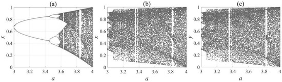 The bifurcation diagram intuitively reflects the values of the control parameters, which causes the system to be chaotic. Figure 3 plots the bifurcation diagrams of the results of Equations (5) and (8). When varying the value of a, the value of the sequence traverses the interval (0, 1), indicating that the system is bounded. Figure 3a implies that when the control parameter is in the interval (3.5699, 4), the initial Logistic system becomes chaotic. Meanwhile, from Figure 3b,c, it can be observed that Equation (8) will become chaotic, since the control parameter is greater than 3, which indicates that Equation (8) has a larger chaotic parameter space. Furthermore, Equations (5) and (8) will not be chaotic for some specific parameters, although the parameters are located in the chaotic area. These can be referred to as period windows, which is a common phenomenon in chaos theory.