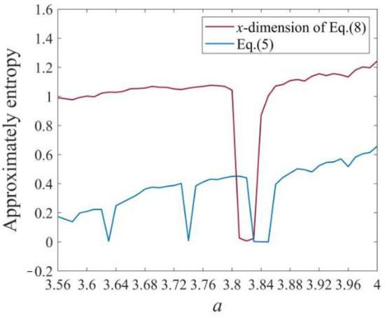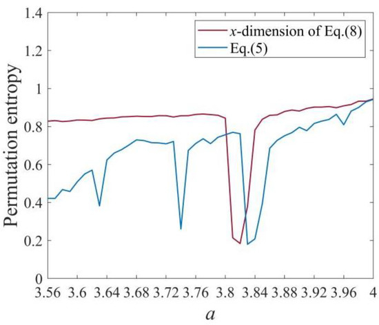 Permutation entropy (PE) introduces the idea of permutation to evaluate the complexity of reconstructed sub-sequences. Similar to ApEn, it is an important index for expressing the complexity of time series. As in the case of the ApEn analysis, the PE values of Equations (5) and (8) were calculated, and the results are provided in Figure 5. From Figure 5, it can be found that the PE values of Equation (8) are always greater than those of Equation (5), except when the control parameter a falls into the period window, which indicates that the delayed coupling Logistic map successfully enhanced the complexity of original Logistic map in this case.