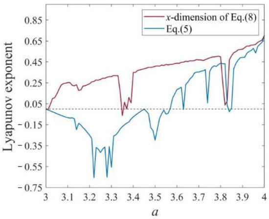 The motion characteristics of a nonlinear system can be reflected by the Lyapunov exponent (LE). A system is regarded as chaotic if it has at least one positive LE. In this test, we compared the LE values generated using Equations (5) and (8) to judge whether the delayed coupling method can enhance the chaotic properties. The results of the LE curves are shown in Figure 6. Figure 6 shows that the improved Logistic map is chaotic (LE > 0), since parameter a is greater than 3, meaning that it can access chaos faster. Furthermore, except for the parameters in the period window of Equation (8), the LE of Equation (8) will be greater than that of Equation (5) for all other parameters, thus proving that the delayed coupling method can effectively improve chaotic behavior.