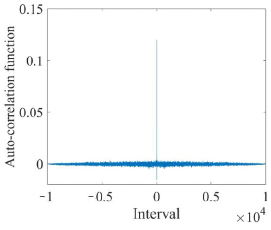 The auto-correlation function is used to describe the degree of correlation of the given sequences at different times, thus further validating their randomness. Figure 7 provides the auto-correlation function of Equation (8). The results indicate that the auto-correlation function has a peak value at zero, while with increasing interval value, the auto-correlation value decreases rapidly to 0. Therefore, the sequence generated by Equation (8) exhibits little correlation, indicating that good randomness has been achieved in this case.