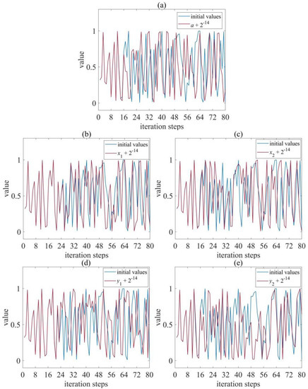 Chaotic systems are sensitive to both initial conditions and parameters, which means that small changes in the initial values and the parameters can produce completely different chaotic sequences. Figure 8 depicts the sensitivity analysis of x-dimensional variables in Equation (8) for different initial values and parameters, respectively. From Figure 8, it can be found that with slight changes in the initial values and parameters, the trajectories separate completely after only 20 iterations, thus demonstrating that Equation (8) is highly sensitive to the initial values and control parameters.