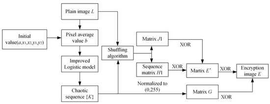 - The final encryption matrix E is obtained using the XOR between the initial encryption matrix E′ obtained in Step 7 and the chaotic matrix G generated in Step 6.