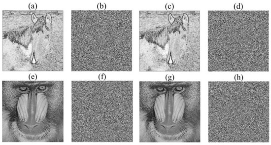 In this section, we take the grayscale images ‘Horse’ and ‘Baboon’ as examples and perform operations including encryption, correct decryption, and incorrect decryption, the results of which are shown in Figure 11. Among them, incorrect decryption consists of changing the initial value slightly, by 10−10, and subsequently verifying the decryption effect. It can be clearly seen from Figure 11 that the encryption algorithm proposed in this paper is able to effectively encrypt and decrypt the image. When the key is wrong, the decrypted image is still full of noise and cannot be recognized, proving that this scheme is secure.
