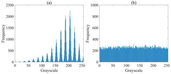 Histograms are an intuitive method for observing the intensity distribution of image pixels, through which the gray distribution can be obtained. The histograms from two images (i.e., the original ‘Horse’ and the encrypted ‘Horse’) are shown in Figure 12. As can be seen from Figure 12a, the histogram obtained from the original image possesses an uneven distribution. Meanwhile, it can be seen in Figure 12b that the histogram from the encrypted image possesses an almost consistent distribution. This result proves that the proposed algorithm can cause the pixel distribution of the encrypted image to be uniform, showing that the encrypted image possesses effective resistance against statistical attacks.
