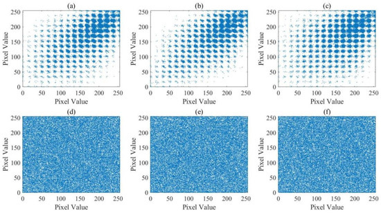 where xi and yi are the data sequences composed of adjacent pixels, and Q is the length of the sample sequence. Figure 13a–f display the adjacent pixel distribution of the original ‘Horse’ and the encrypted ‘Horse’ image in different directions (i.e., horizontal, vertical, and diagonal). From Figure 13a–c, it can be seen that the distribution points are clustered near the diagonal line, indicating that neighboring pixels with strong correlations appear in the original image. According to Figure 13d–f, points are distributed with no special appearance, indicating that there is no correlation between neighboring pixels in the encrypted image. Observing the correlation coefficients in Table 1, the absolute values of our correlation coefficient in three directions are all close to 0, which is also better than the results obtained for some other encryption algorithms. Thus, our encryption algorithm can reduce the pixel correlation of plain images and has strong resistance to correlation attacks.