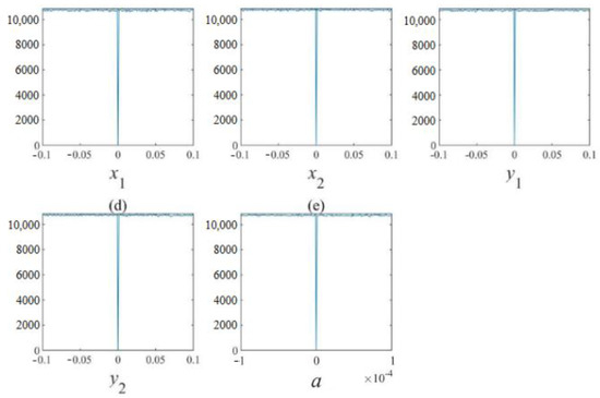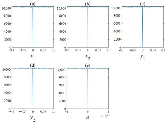 Key sensitivity means that the image encryption and decryption will undergo a notable change if the secret key is altered slightly. At the same time, keys are provided that add the average value of the plain-text image, so that the key will have plain-text correlation and should be resistant to known plain-text attacks. Here, we performed a visualization experiment with minor modifications to the initial values (a, x1, x2, y1, and y2), and the decrypted images are shown in Figure 14b–f. From the resulting figure, it can be seen that when the initial values and parameters are changed by 10−10 separately, the decrypted images cannot be restored to the initial image. Furthermore, the following equation was used to calculate the mean square error (MSE) to carry out the numerical experiments.