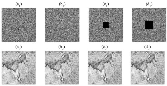 Robustness testing aims to detect whether the proposed method can restore the original image when the image pixels have been partially destroyed. In a secure encryption algorithm, the original image will be able to be recovered even if some pixel data are lost or filled with some noise. In this test, we added varying degrees of ‘salt and pepper’ noise to the encrypted “Horse” image and performed a data loss attack, as shown in Figure 17a1–d1. As can be seen from Figure 17a2–d2, when using our decryption algorithm, the four ciphertext images subjected to different attacks could all be restored to a state in which their original images are recognizable. These results prove that the encryption scheme proposed in this paper is robust against noise and data loss attacks.