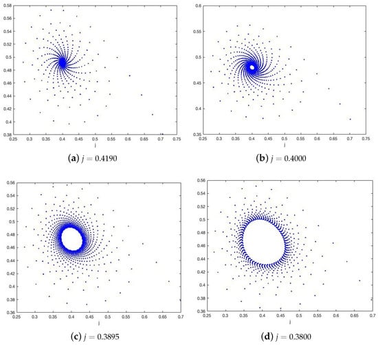 Figure 3. Phase portraits for System (8) with f = 0.2 , g = 0.1 and h = 0.1 and different j when the initial value ( x 0 , y 0 ) = ( 0.4 , 0.48 ) .