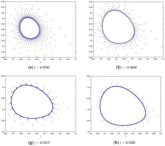 From the phase portraits in Figure 2 and Figure 3, we infer the stability of P 3 . Figure 2e–h show that the closed curve is stable outside, while Figure 3a–d indicate that the closed curve is stable inside for the fixed point P 3 as long as the assumptions of Theorem 6 hold.