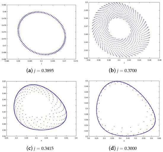 Figure 1a shows the bifurcation diagram of System (8) on the ( j , x ) -plane, from which the fixed point P 3 = ( 0.4000 , 0.47373 ) is stable when j > j 0 = 0.3895 while unstable when j < j 0 . Hence, a Neimark–Sacker bifurcation occurs at the fixed point P 3 when j = j 0 , whose multipliers are λ 1 , 2 = 0.9520 ± 0.3061 i with | λ 1 , 2 | = 1 . The corresponding maximum Lyapunov exponent diagram of System (8) is plotted in Figure 1b, from which we can easily see that the maximal Lyapunov exponents are always positive when the parameter j ( 0.1 , 0.7 ) . That is to say, at this time, chaos occurs. This is a kind of new phenomenon whose continuous system does not exist.