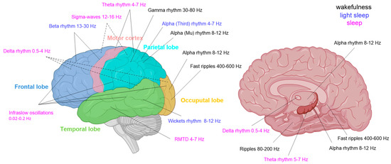 Localization of rhythmic activities of the human brain (RMTD—rhythmic mid-temporal theta burst of drowsiness) (links to sources are provided in the text and Table 2).