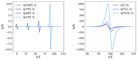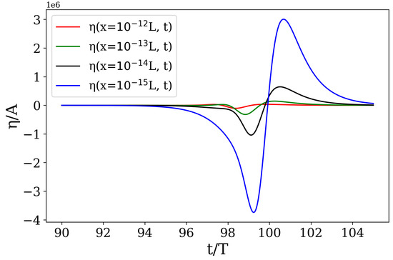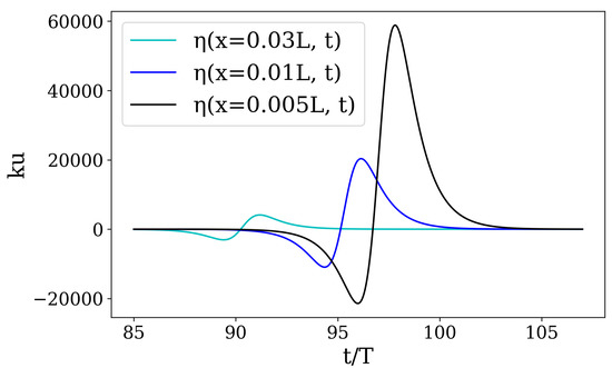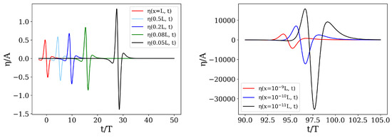 therefore, it can be seen from Formula (36) that the wave amplitude is modified in direct proportion to ; that is, it changes as Green’s law suggests. This can be seen in the illustration of the example below (Figure 2).
