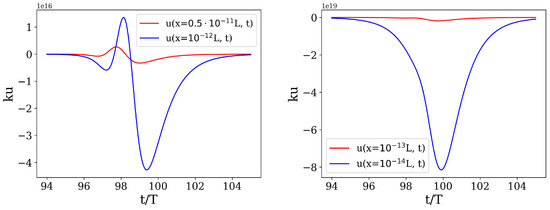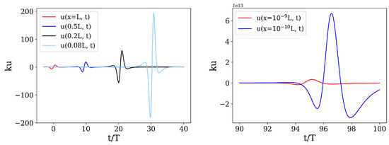 The resulting Equations (3) and (5) for displacement and velocity, generally speaking, are not equivalent; that is, not every Equation (3) solution is a solution of (5) and vice versa. It is worth noting that in classical examples of mathematical physics, Equations (3) and (5) are considered separately, although to describe the wave process, it is necessary to know all the wave field components; that is, both the displacement and the velocity u. By solving these equations separately, we can obtain large classes of mathematically good solutions. However, when finding the second component, some solutions from these classes may turn out not to be physically feasible or give impossible results.